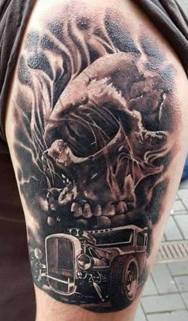 Man with car tattoo on left sleeve. Nestled in the Blue Ridge Mountains of southwestern Virginia Hot Rod Tattoo has been providing clients with high-quality custom designs since 2003. Kristen Goetz is a Long Island based tattoo artist illustrator and painter.